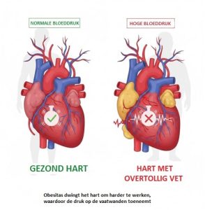 Bij obesitas moet het hart harder werken om bloed door een groter netwerk van bloedvaten te pompen, wat de druk op de vaatwanden verhoogt. Ook beïnvloedt overtollig vet hormonen die de bloeddruk reguleren.